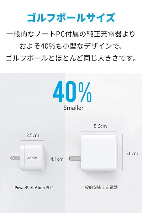 本体サイズは35mm x 41 x 55mmと小さく、約53gということでノートパソコンを充電できるPD充電器としては世界最小としています。