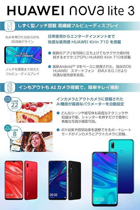 リンク:HUAWEI nova lite 3(アマゾン)/価格コム(いずれもレビューあり)