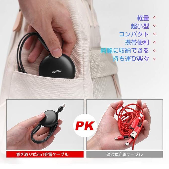 リンク:Baseus製3in1 巻き取り 充電ケーブル(Amazon.co.jp)