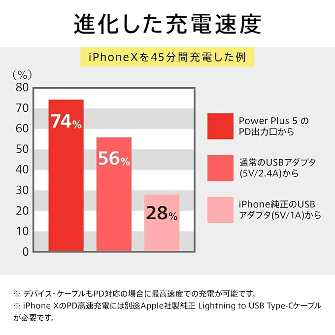 USB-CにiPhoneⅩを繋いだ場合は45分間で0%から約74%まで給電可能。