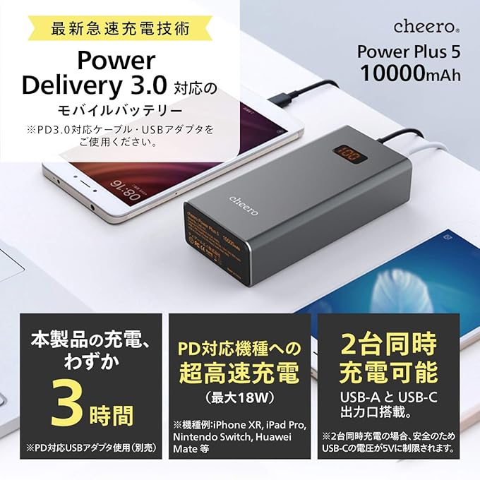 インターフェイスは出力専用のフルサイズUSB(USB-A/最大2.4A)と入出力用のUSB-Cポート(最大3A)を1つずつ備え、このUSB-C側は最新の急速充電規格Power Delivery 3.0 対応となっており、PD対応USBアダプタ(18W)使用で『cheero Power Plus 5』本体を約3時間でフル充電できるという。