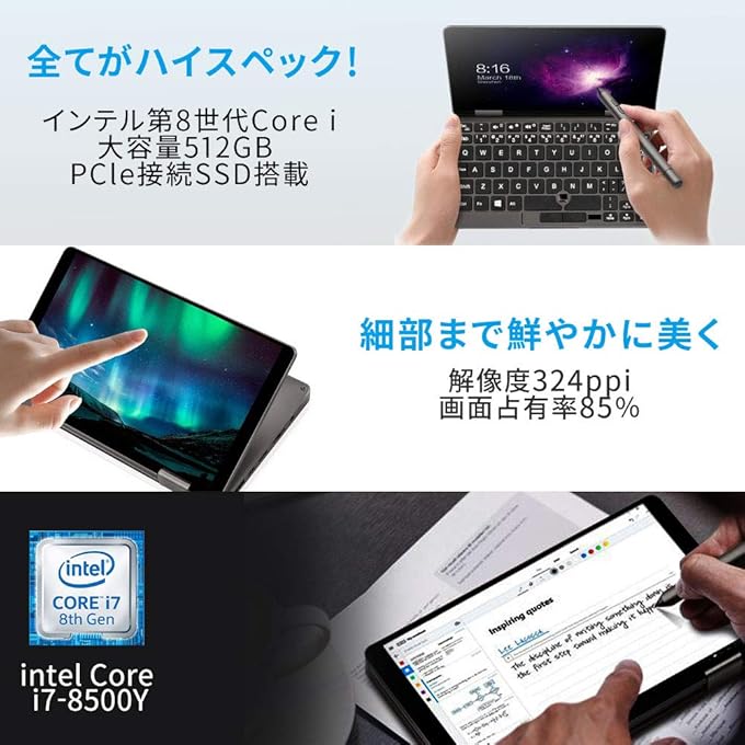 600g未満のUMPCとしては初めて第8世代インテルCore i7-8500Yプロセッサーを搭載した「プラチナエディション」。高性能かつ消費電力が少ないためバッテリー持続時間も向上、最高のUMPCを求める方向けのプレミアムバージョンです。