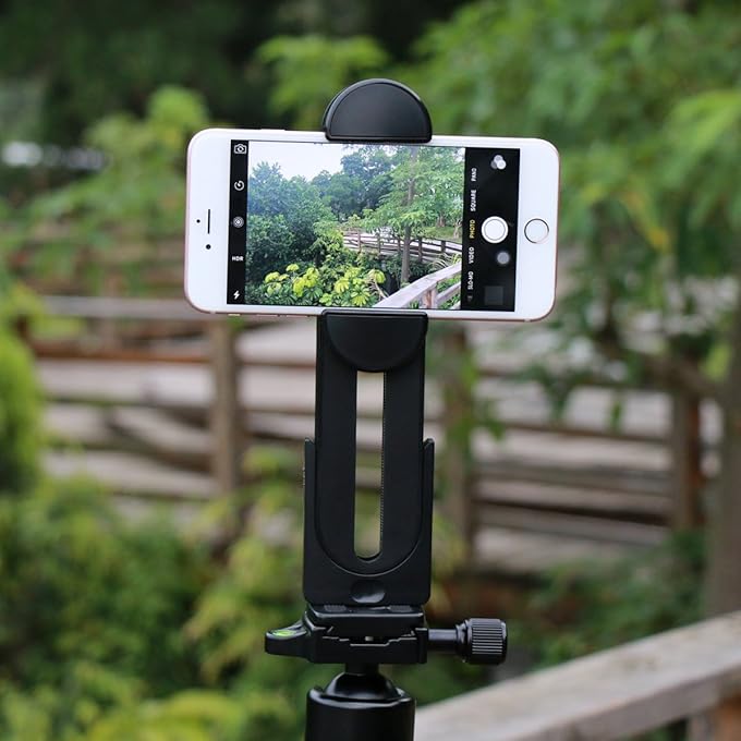 上図のマンフロット製ホルダーは三脚ネジ穴が存在することで省スペースな一脚などを併用可能、様々な場所でスマートフォンが使える。
