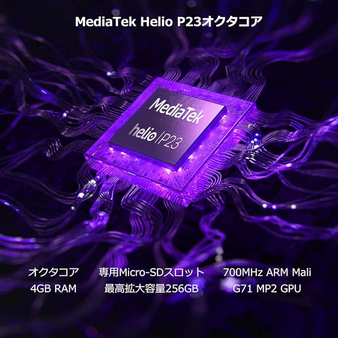 CPUにはミドルレンジSoCの「MediaTek Helio P23(2.0GHzx4コア+1.5GHzx4コア)オクタコア」を搭載。高負荷を担うCortex-A53プロセッサは最高2.3GHzで駆動(MediaTek Helio P23製品ページより)となっている。
