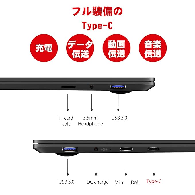 インターフェイスにはMicroHDMI、USB3.0x2基、USB-C、イヤホンジャックを備えます。