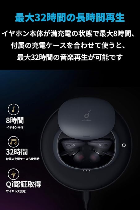 バッテリー駆動時間は最大8時間、付属の充電ケース併用で最大32時間の長時間再生に対応なほか、USB-CまたQi認証のワイヤレス充電器が利用可能。また、15分間の充電で約2時間の音楽再生が可能、フル充電までは1.5時間が必要。