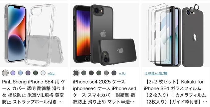 先ほどのGoogle Pixel 9aと同じく近日発売という状態の「iPhone SE4」の保護ケースまでアマゾンで販売されていた。