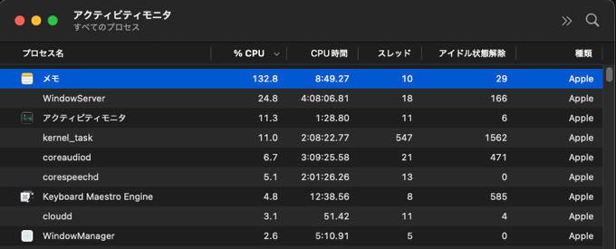 Appleの事情(後述)により、いつからかシステムアップデートでメモアプリから「ローカルメモ」が排除されてしまった。そのため、全てのメモはオンライン同期が基本となり、CPU消費が高い状態(下図)のままとなっていた。