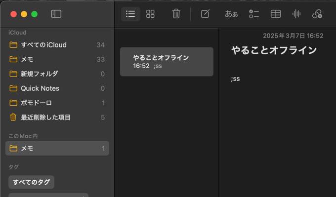 メモ内にある記載「;ss」は自動化アプリ「Keyboard Maestro」のショートカットワードなので気にしないでいただきたい。同アプリがiPadOSでも使えるようになったら速攻でMacBookからiPad Proへ乗り換えたいのだけれども——————