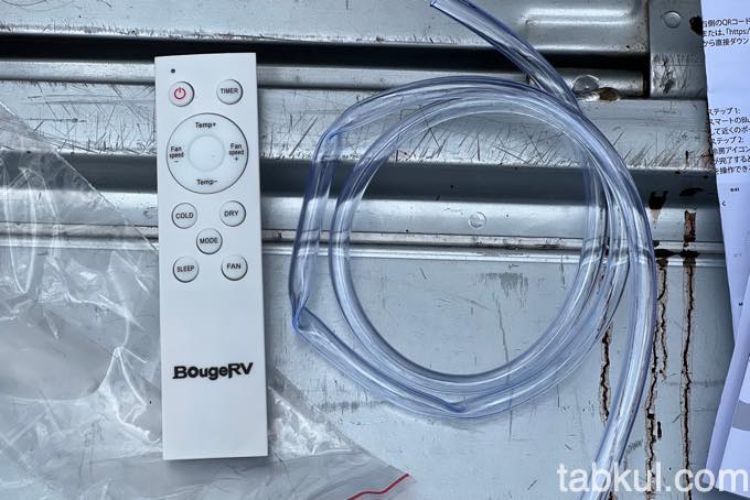 左から排気ホース、排気ホースの接続アダプター、袋にはリモコンとドレンホースと説明書、そして本体という構成だった。