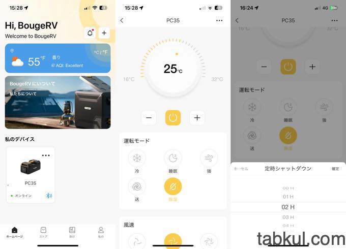次に「BougeRV 3500BTU」のアイコンを選択すると上図中央の画面へと遷移。ここで求める運転モードを選ぶことで「BougeRV 3500BTU」が動き出す。上図右のとおりタイマー機能あり。