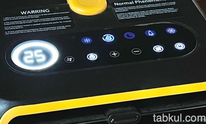 アプリ画面と同じく「BougeRV 3500BTU」本体にも気温とモードが表示されている。