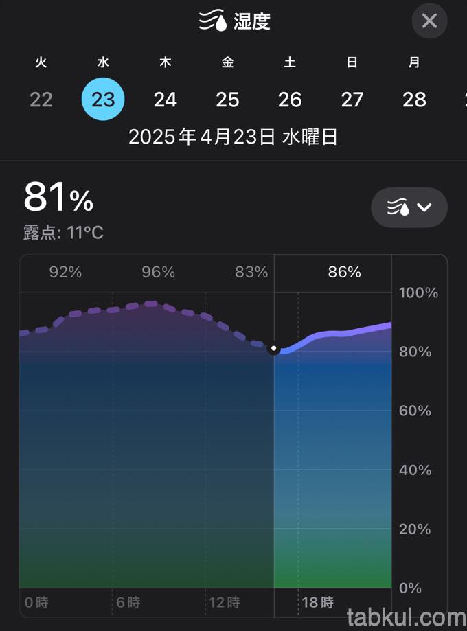 ご覧の通り湿度81%に到達している。しかもこの数値は同じ地名の山の麓にある街にある観測データだ。つまり街から遥か上空の標高1100mの山奥はさらに湿度が高い。