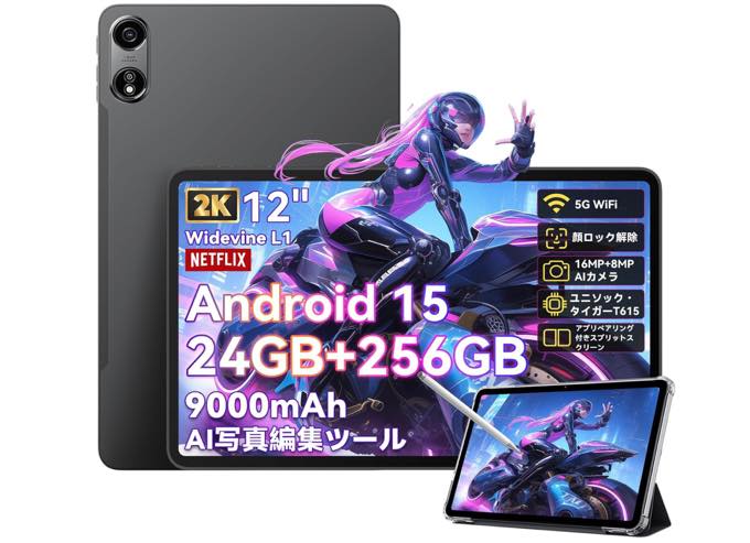 ストレージ256GBにバッテリー容量9000mAhなど12インチ2K解像度でも十分に楽しめそうな仕様となっていた。同社は高性能・低価格のタブレットとして打ち出している。