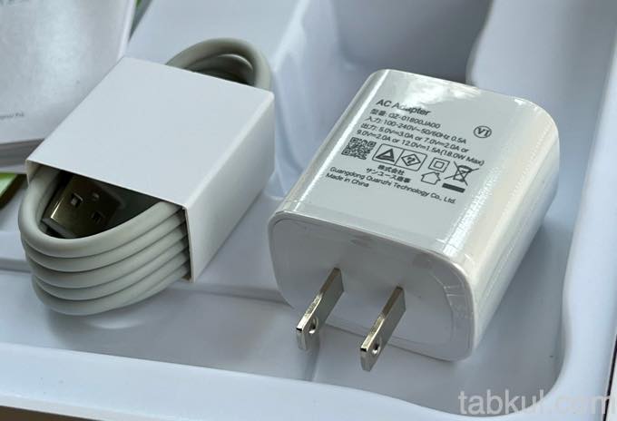 USBケーブルの端子は先ほど書いたとおりだが、充電器のポートはUSB-Aとなっていた。最大出力は9V=2.0A or 12V=1.5Aとなっており最大出力は18.0W。