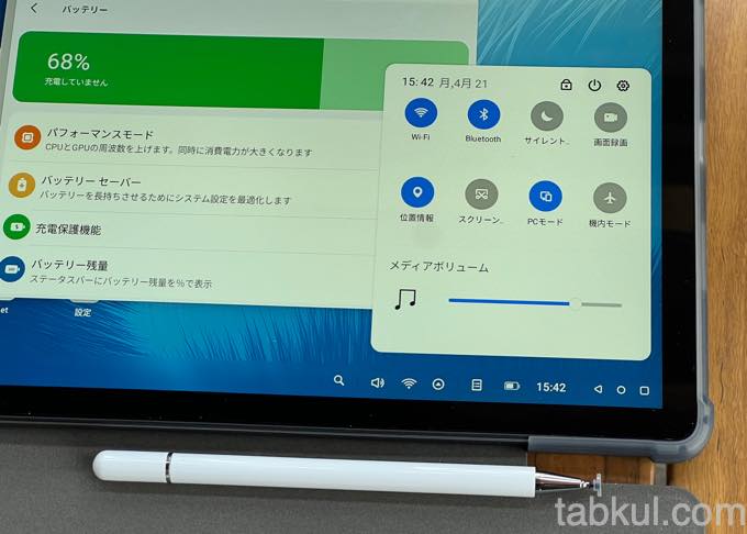 実際に「Blackview MEGA 8」を使っていると13インチという大画面なので基本的に持ち続けて使うスタイルではない。そんなときに充電不要で意外と細かなタッチ操作が行えるスタイラスペンが活躍した。