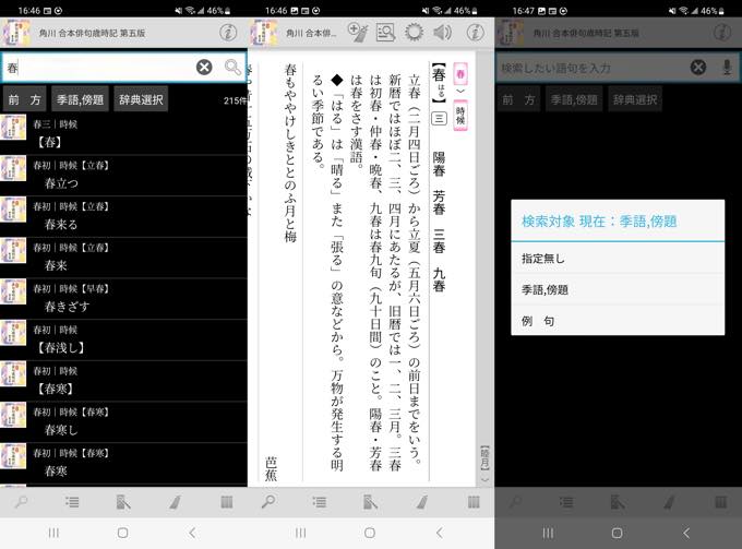 ・「季語,傍題」「例句」ごとに検索する機能を搭載。