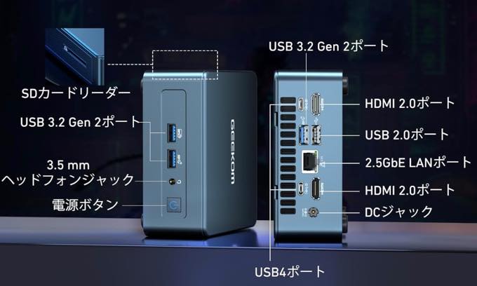 - 端子:2xHDMI、2xUSB4.0、3xUSB3.2、2xUSB2.0、1X2.5G LAN、1X3.5mm headphone jack 、1xSD card ポート