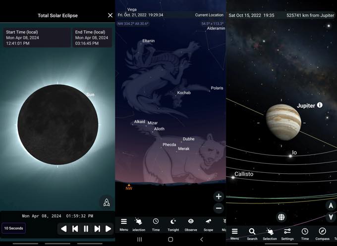 今、過去、または未来の日食を見る!地球上の任意の場所から多くの年前または未来の夜空をシミュレートします!SkySafariのタイムフローで流星群、彗星接近、トランジット、コンジャンクションなどの天文イベントをアニメーションで表示します。