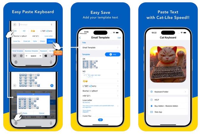 猫キーボードは、メールの定型文やお気に入りのフレーズ、住所、さらには銀行情報まで、さまざまなテキストをキーボード上のフォルダに整理・保存できる無料アプリです。