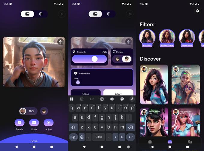 上図は左上がiPhoneのフロントカメラで撮影して加工した自画像。上図中央(2枚目)はフィルターのかけ具合(0にすればリアルな写真に戻る)で、プロンプトを手入力できるのも興味深い。ただこれはサーバーへデータを送信しているのかは不明。心配な人は実行しない方が良い。そして上図右(3枚目)はフィルター一覧でバンパイアとかエルフとか様々なモデルが用意されていた。ただStable Diffusionのようにジブリ風とかアニメ風、日本人風といったモデルは選べずアプリ名のとおり「カートゥーン系」になる。