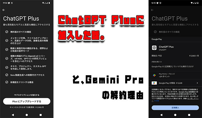先日SNSでGeminiの月額20ドル課金するサブスクへ加入したと呟いたが、最終的に解約してChatGPT Plusへ加入した。