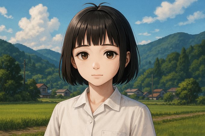アップロード画像は同じにしてプロンプトは「キャラクターをリアル寄りのアニメ風イラストにして、背景は田舎の風景にして。」と書いた。