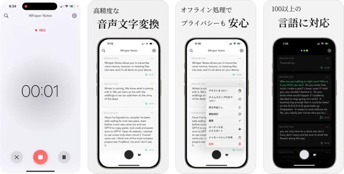Whisper Notes: 高度なWhisper AIモデルを使用した、オフラインで非常に正確な音声からテキストへの変換を、完全にプライバシーを守りながらお手持ちのデバイスで実現。