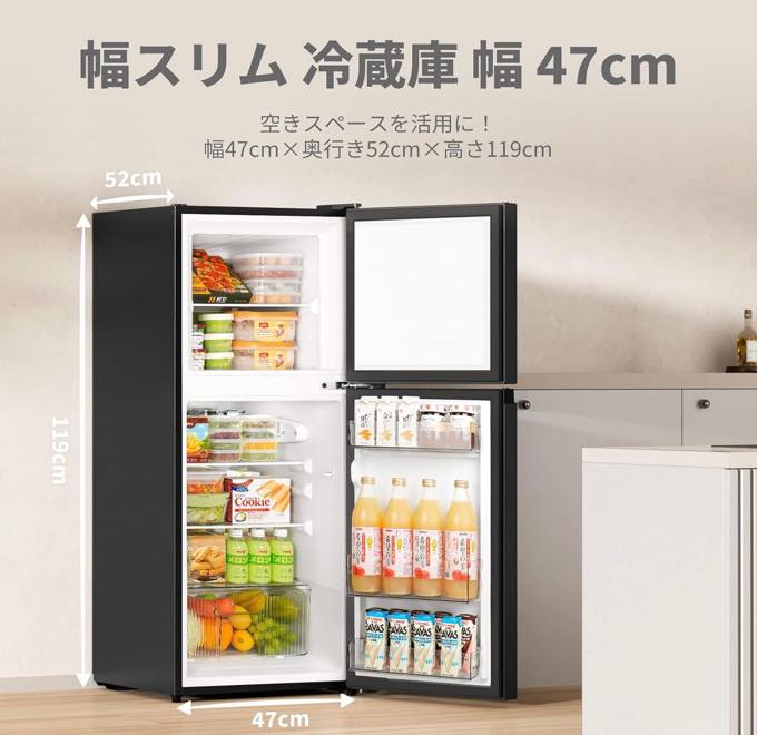 2024年最新モデルとして登場した製品は、幅47cmのスリム設計ながら132Lの容量を確保。ブラックのシックなカラーリングはキッチンインテリアをグッと引き締め、一人暮らしはもちろんセカンド冷蔵庫としても活躍が期待できる。