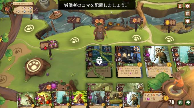 1.) 労働者コマの配置。 労働者をさまざまな場所へと送って資源を集めましょう! 労働者たちは果実、小枝、樹液、小石にカードまで集めてきてくれる、街づくりには欠かせない仲間たちです。