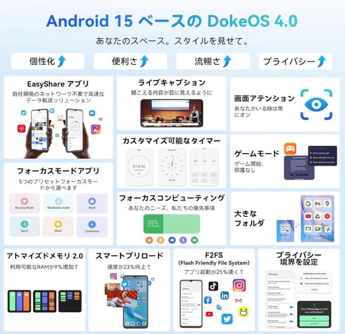 OSはAndroid 15ベースのDokeOS 4.0搭載、今後のOSアップデートにも期待できる。アンドロイド端末のカスタムログと言えば、メーカーの広告等が多い印象だが、やはりBlackviewらしく進化していた。