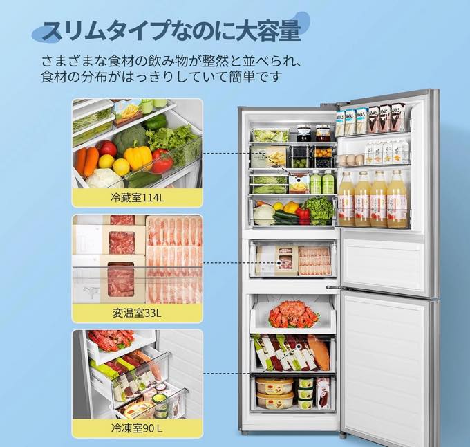 冷凍室が90 L、変温室も冷凍使用が可能な33 Lと、実質冷凍スペースが約半分を占める設計。レビューでも「冷凍食品をまとめ買いできる」「作り置き派に最適」と評価されています。
