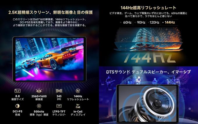 Amazonの販売タイトルを見れば「Snapdragon7+Gen3 2560×1600解像度 144Hz高リフレッシュレート 20GB+256GB+1TB拡張 7300mAh PD20W デュアルスピーカーDTSサウンド 6軸ジャイロ」と高スペックぶりがわかる。