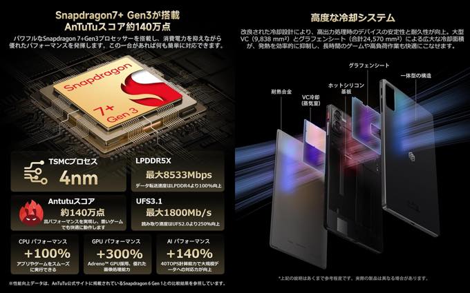 | CPU | Snapdragon 7+ Gen3、4nmプロセス、Antutuスコア約140万点 |