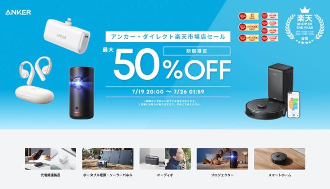 楽天の恒例イベント「お買い物マラソン」にあわせてANKERが楽天市場の公式ショップにおいて最大50%オフセールを7月19日20時より開催した。