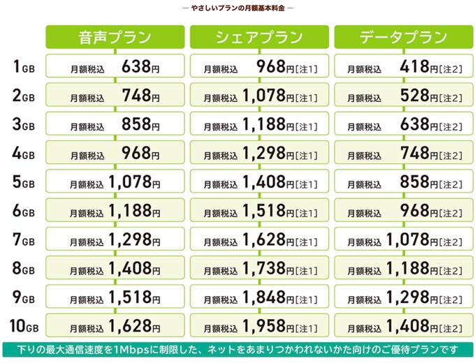 「やさしいプラン」は、2020年9月にデータ通信容量3GB/6GB/8GBの3プランで提供を開始し、下り(ダウンロード)の最大通信速度を500kbps(0.5Mbps)に抑えることで、通常プランよりも1GB~10GBをそれぞれ税込220円安い月額基本料金に設定している。