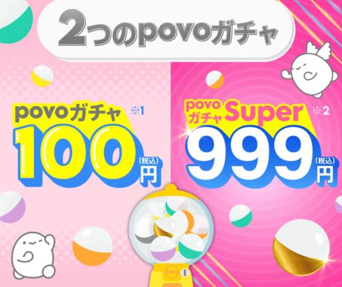 KDDIおよび沖縄セルラーは2025年8月14日、povo2.0の期間限定トッピングとして、最大12週間データ使い放題などのデータが抽選で当たる「povoガチャ」2種の提供を同日付で開始した。