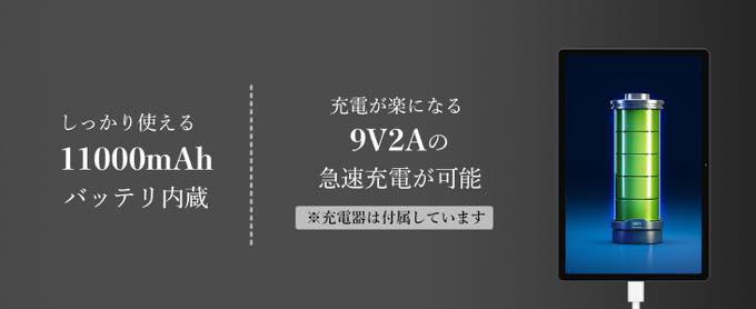 上記スペックの他にガラス保護フィルムや9V2A充電器+ケーブル、スタンド付き保護カバーケース、スタイラスペンといったものが付属している。