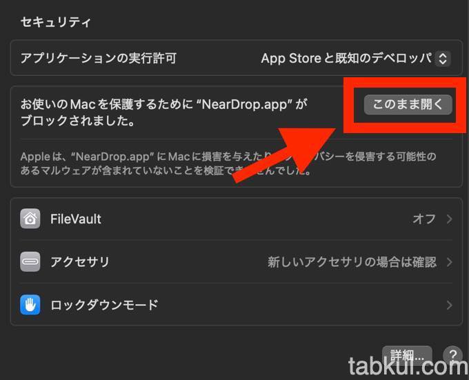 そのため、「NearDrop.app」を実行して削除確認画面を表示させたらMACの「設定」アプリを開き、セキュリティメニューの最下部にある「NearDrop.app」の許可を行う。
