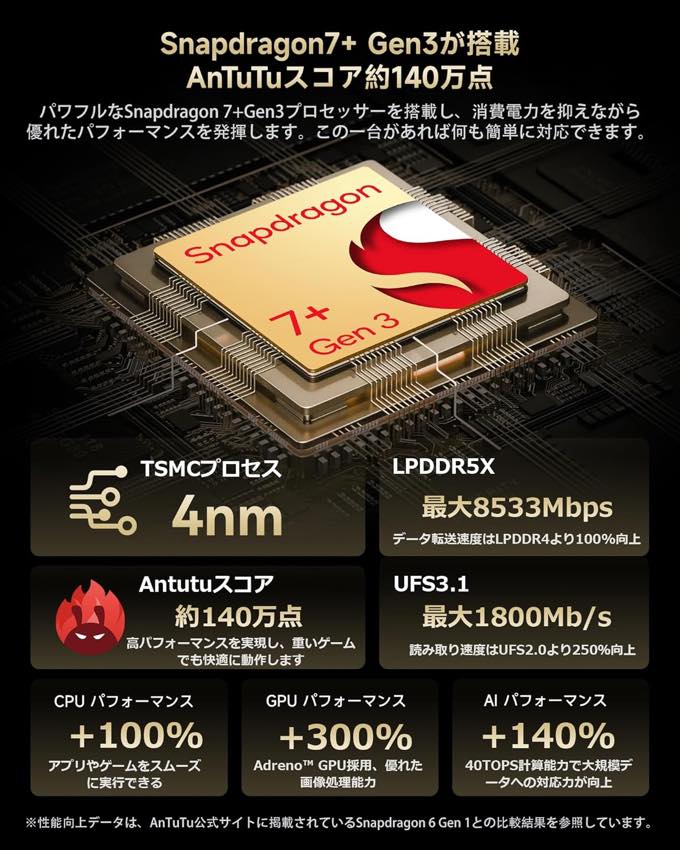 パフォーマンスをみるとSoCがQualcomm Snapdragon 7+Gen3というUNISOCチップの上位的な立ち位置のMediaTekチップを超えるQualcommチップを積んでいる。