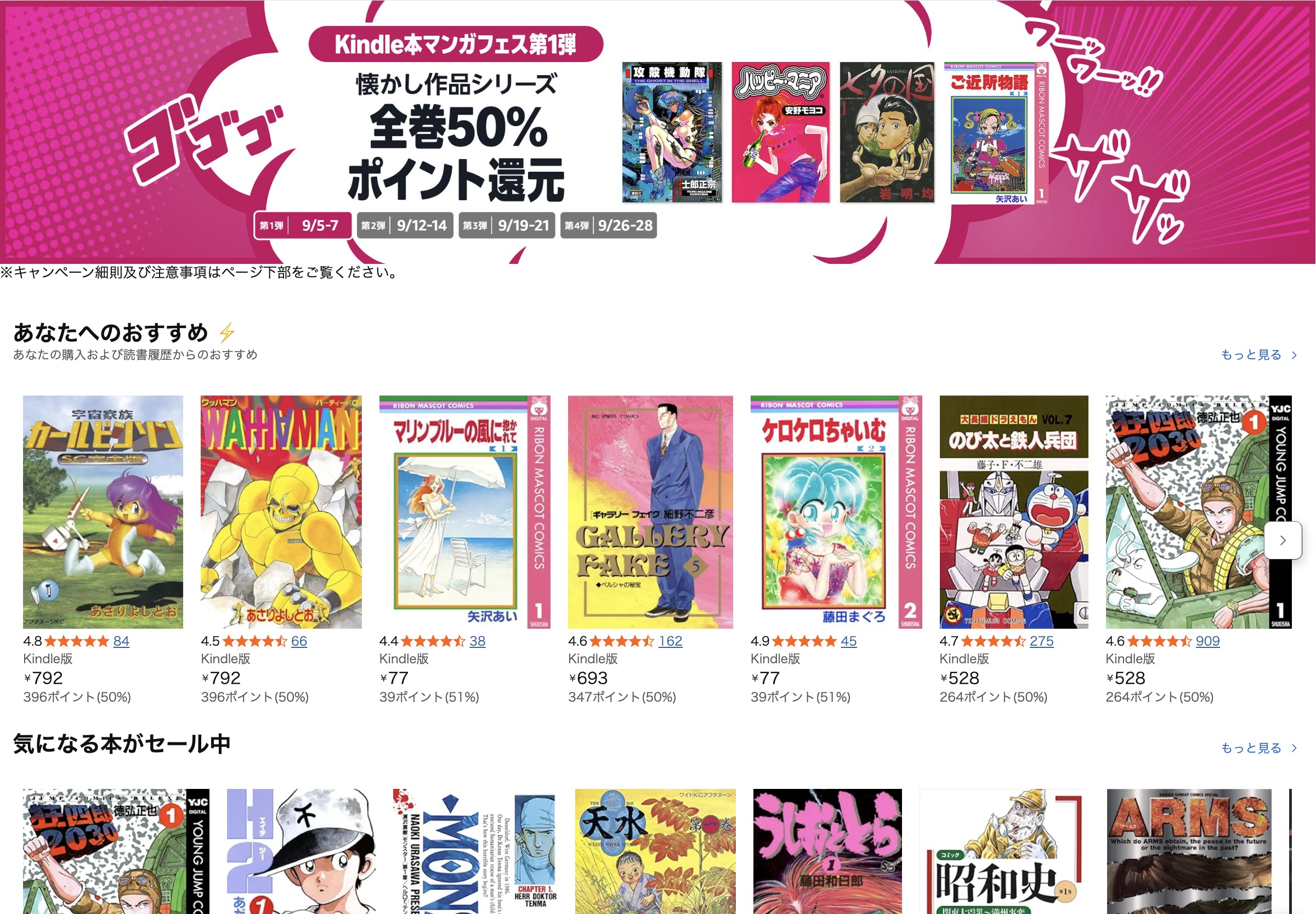 H2やキャプ翼など懐かし作品が全巻50%pt還元に!Kindle本マンガフェス第3弾は9/21まで開催中