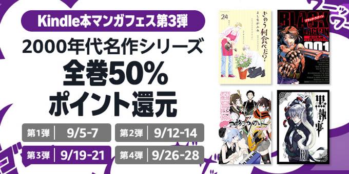 アマゾンジャパンの電子書籍サービスKindleストアにおいて、9月5日から9月7日と短期ながらドラゴンボールやH2、幽遊白書といった人気漫画を対象に全巻が50%ポイント還元で購入できるキャンペーンが実施されている。
