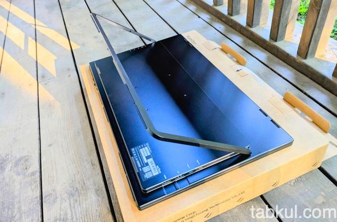 ヒンジとキックスタンド、いずれも硬めに調整されているため上図のようなストイックな直立にも対応した。