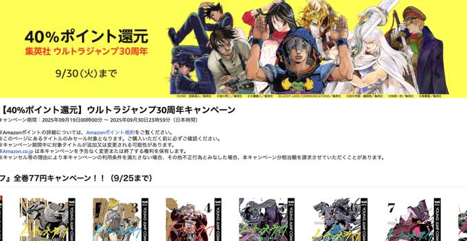 アマゾンジャパンの電子書籍サービスKindleストアにおいて「集英社 ウルトラジャンプ30周年」が開催中、対象タイトルは少なくとも40%ポイント還元となり、50%ポイント還元もあった。