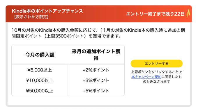 キャンペーン期限は10月31日まで、それまでにKindle本を買うかもしれないのならエントリーを。