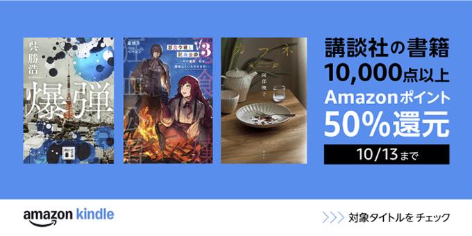 アマゾンジャパンの電子書籍サービス”Kindleストア”において、講談社の書籍を対象にAmazonポイントを書籍代金から50%還元するキャンペーンを開催している。