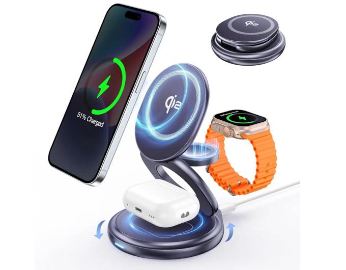 携帯性に優れたQi2対応のMagSafeスマホリングでありながらスマホスタンドになり、さらにはAirPodsとApple Watchを充電可能。