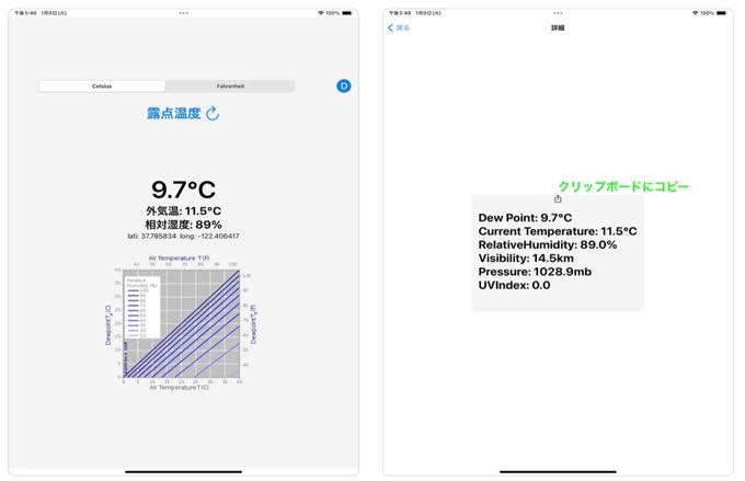 このアプリだけで現在地点の露点温度、外気温、相対湿度がすぐわかります。