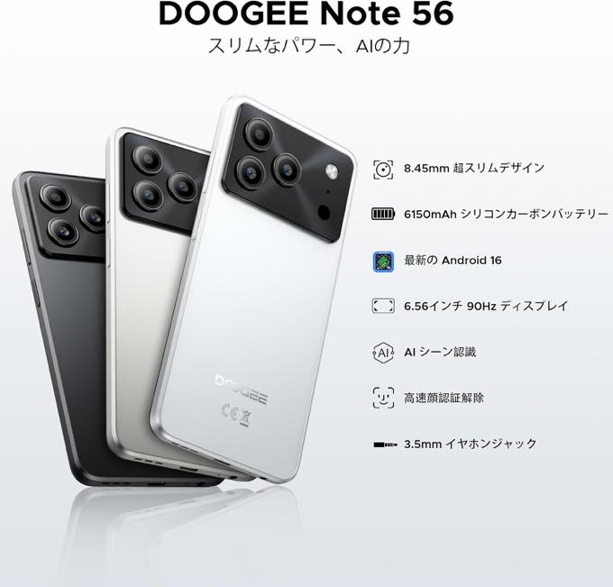 「DOOGEE NOTE56」はNote58(4G対応モデル)やNote59(5G対応モデル)に続く、最新モデルで「高性能 × 低価格 × 最新OS」を実現したコスパ重視のスマートフォンという位置付け。