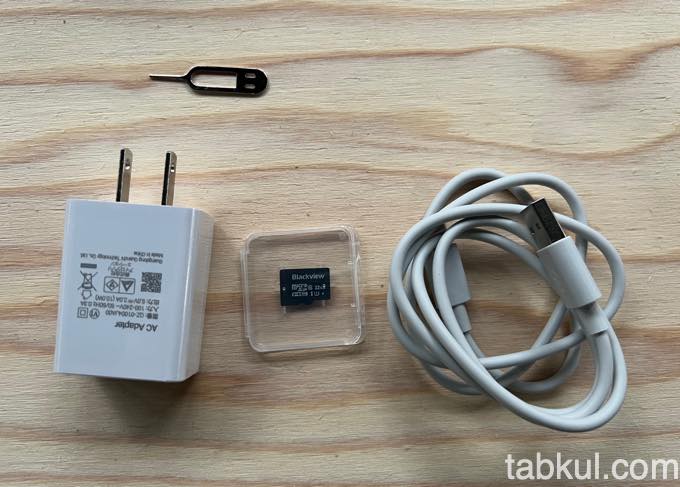 ACコンセントは日本仕様、USB-A to USB-CケーブルとSIMピンがある。